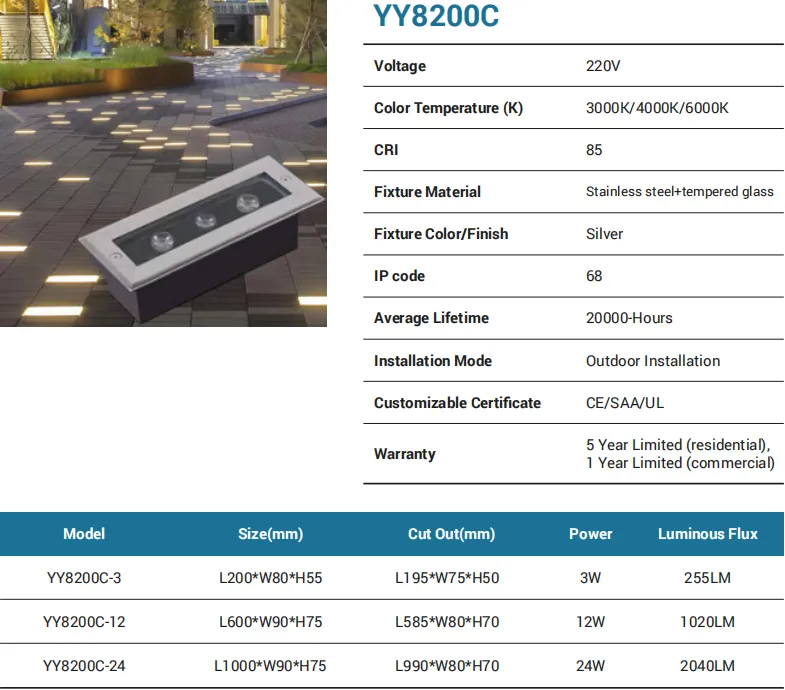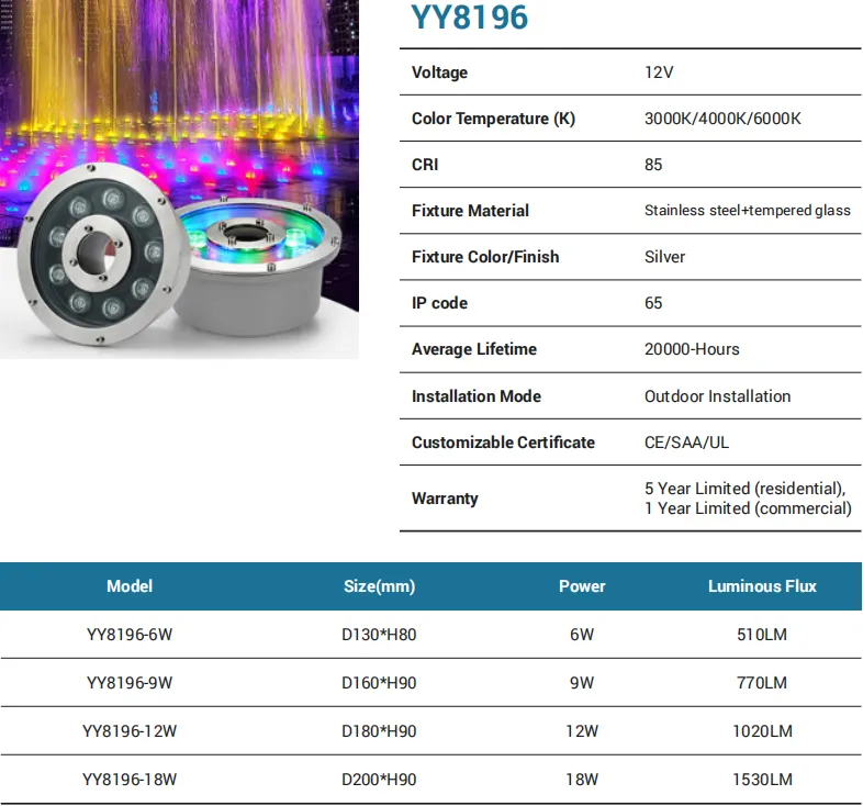 Low-voltage 12V stainless-steel fixture with tempered glass for poolsides, fountains, and splash-prone landscapes. Available in 3W/6W/9W/12W/18W (up to 1530 lm) with CCT 3000K/4000K/6000K and CRI 85. Rated IP65 and intended for outdoor installation, it provides 20,000 hours of service life and CE/SAA/UL certification. Covered by a 5-year residential / 1-year commercial warranty.