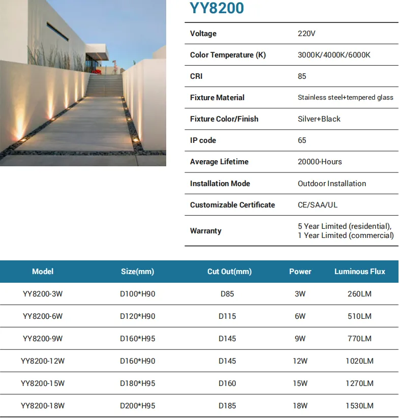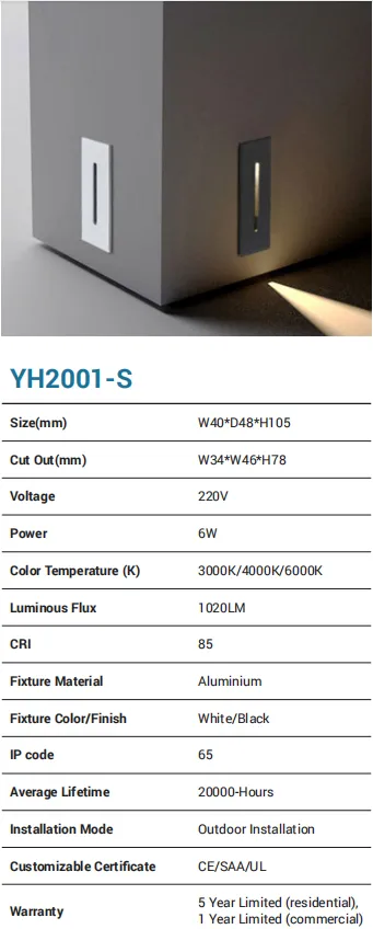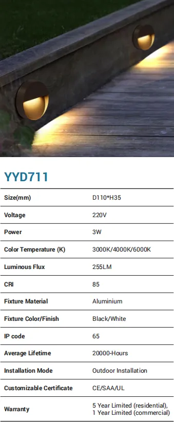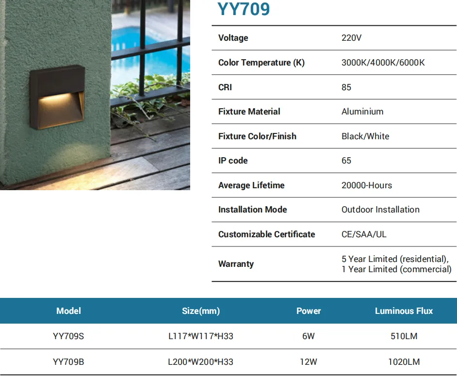 Discreet, glare-controlled step lighting in a slim aluminum body (black/white). Two sizes: YY709S (L117×W117×H33 mm, 6W, 510 lm) and YY709B (L200×W200×H33 mm, 12W, 1020 lm). All versions provide CCT 3000K/4000K/6000K, CRI 85, and are IP65 for outdoor stairs, decks, and corridors. Outdoor installation, 20,000-hour lifetime, CE/SAA/UL certified, with 5-year residential / 1-year commercial warranty.