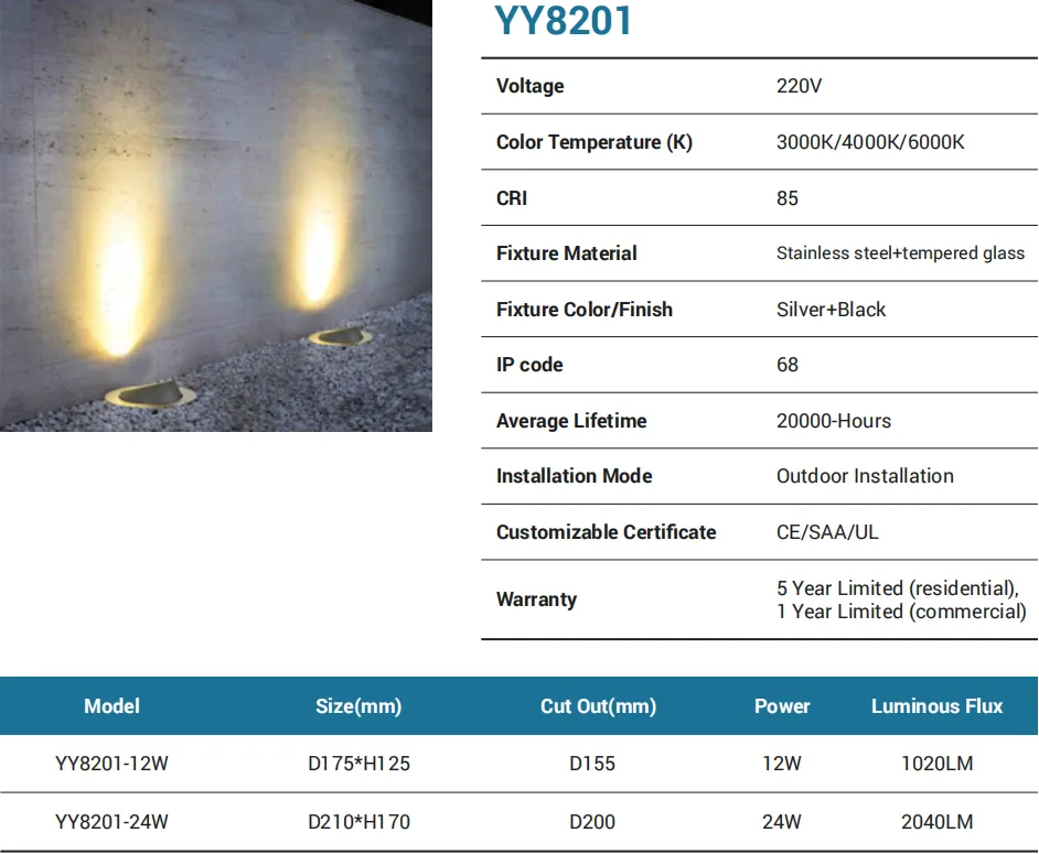 Architectural in-ground uplights for trees, facades, and columns. Forged from stainless steel + tempered glass, rated IP68, and built for outdoor installation. Two outputs: 20W (Ø200×H170 mm, cut-out 190 mm, 1700 lm) and 30W (Ø250×H170 mm, cut-out 240 mm, 2550 lm). Both offer CCT 3000K/4000K/6000K, CRI 85, CE/SAA/UL compliance, 20,000-hour life, and a 5-year residential / 1-year commercial warranty.