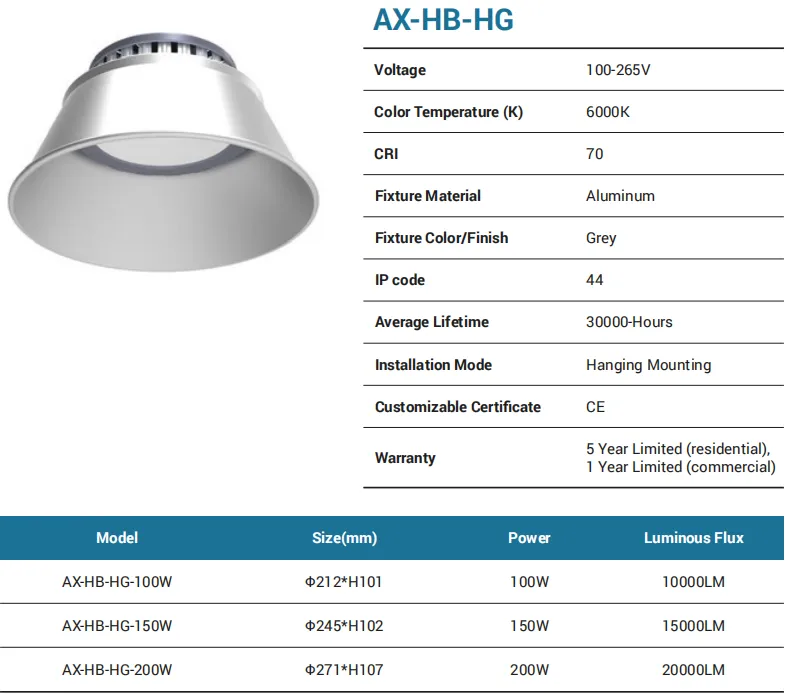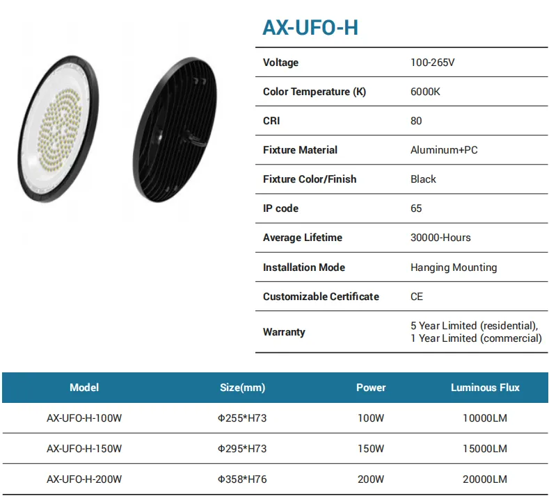 A high-efficiency UFO high bay designed for factories, warehouses, and gyms. Universal 100–265V input with 6000K crisp white, CRI 80, and IP65 protection. Three power options—100W (10,000 lm), 150W (15,000 lm), 200W (20,000 lm)—in compact Ø255/Ø295/Ø358 mm housings. Aluminum + PC construction, hanging mounting, 30,000-hour lifetime, CE certified, and a 5-year residential / 1-year commercial warranty.