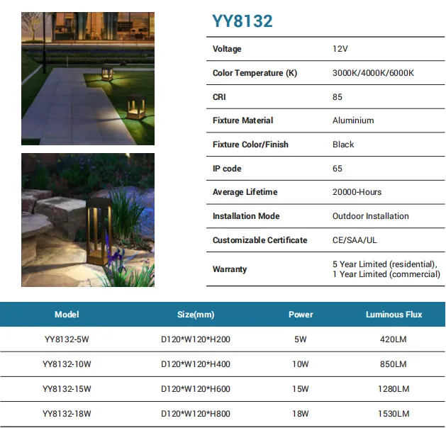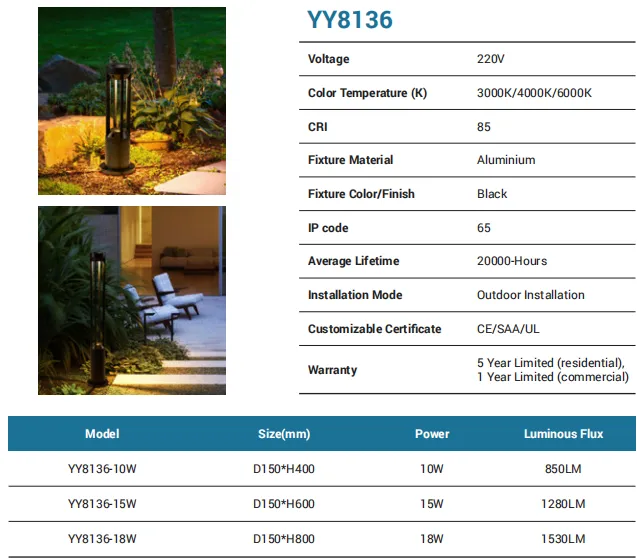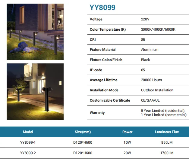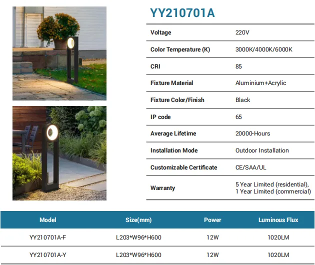 Purpose-built for landscape paths and garden borders, this aluminum + acrylic bollard in black outputs 1020 lm from a 12W LED module (models A-F / A-Y, L203×W96×H600 mm). Choose 3000K/4000K/6000K with CRI 85 for the right ambience. Rated IP65 and engineered for outdoor installation, it offers 20,000 hours of service life, CE/SAA/UL compliance, and a 5-year residential / 1-year commercial warranty.