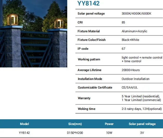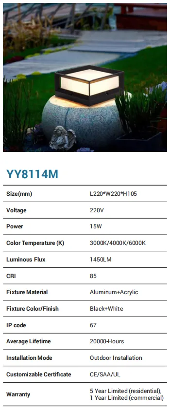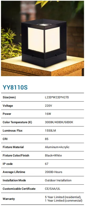A sleek cube post light that elevates paths and entries. The aluminum + acrylic build in black & white houses a 16W LED producing 1550 lm, with CCT 3000K/4000K/6000K and CRI 85. With a robust IP67 rating and outdoor installation design, it’s ready for harsh weather. Backed by CE/SAA/UL, 20,000-hour lifetime, and 5-year residential / 1-year commercial warranty.