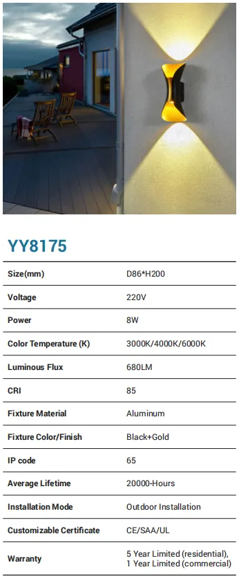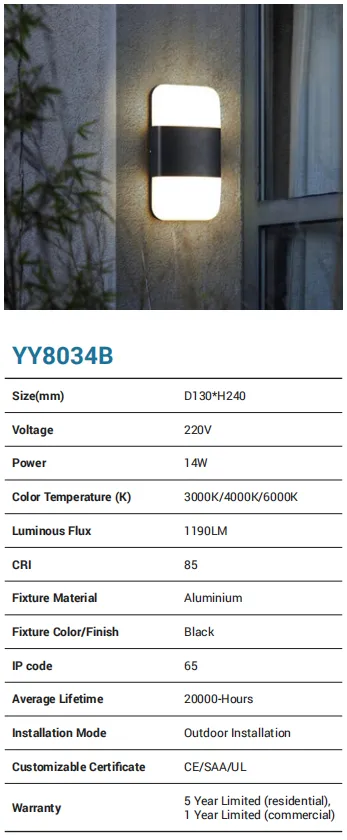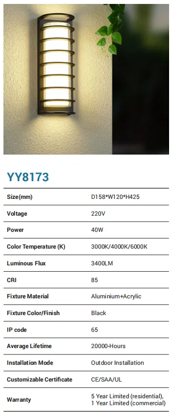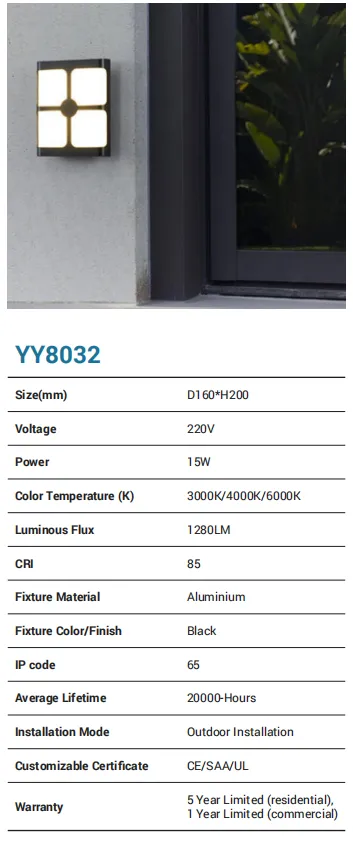 A compact, weather-ready wall lamp built from aluminum and finished in black for a clean, modern look. Running on 220V with a 15W LED engine, it delivers up to 1280 lm with selectable 3000K/4000K/6000K color temperatures and CRI 85 for faithful color. Rated IP65, it handles rain and dust with ease and is designed for outdoor installation. Expect 20,000-hour life, CE/SAA/UL compliance, and a 5-year residential / 1-year commercial warranty.
